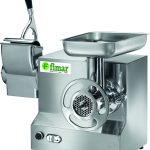 Abbinato tritacarne grattugia. Struttura in alluminio lucidato con tramoggia in acciaio inox – gruppo macinazione estraibile in acciaio inox AISI 304 – comandi in bassa tensione – bocca ingresso carne ø 52 mm – riduttore con ingranaggi a bagno d’olio – in dotazione sistema – enterprise con piastra inox (fori ø 6 mm) e coltello inox autoaffilante. La parte della grattugia è caratterizzata da: bocca in alluminio lucidato 140×75 mm – rullo in acciaio inox – griglia inferiore di protezione – microinterruttore leva pressore grattugia.
