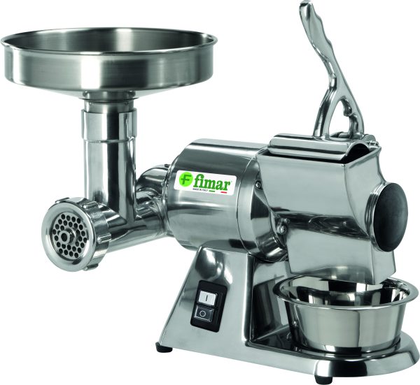 Struttura in alluminio lucidato con tramoggia in acciaio inox – gruppo macinazione in alluminio – bocca ingresso carne ø 52 mm – in dotazione sistema enterprise con piastra inox (fori ø 6 mm) e coltello inox autoaffilante. La parte della grattugia è caratterizzata da: bocca in alluminio lucidato 105×65 mm – rullo in acciaio inox – griglia inferiore di protezione – microinterruttore leva pressore grattugia.