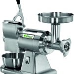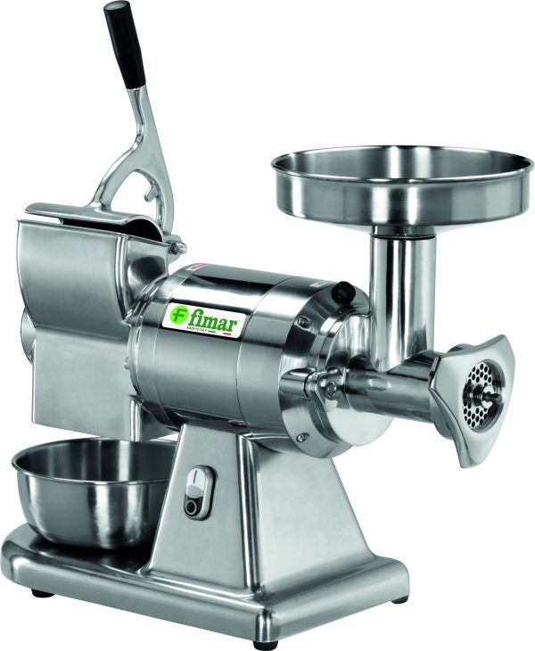 Abbinato tritacarne grattugia. Struttura in alluminio lucidato con tramoggia in acciaio inox – gruppo di macinazione inox AISI 304 completamente removibile che permette di poterlo collocare in frigorifero senza che debba essere pulito dai