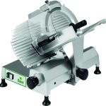Macchina per affettare salumi, formaggi, carni ecc.. Struttura in lega leggera di alluminio anodizzato – blocco piatto vela – anello fisso protezione lama – spessore taglio da 0 a 15 mm – paralama estraibile – pomello regolazione vela con scala graduata – affilatoio fisso con coppia di smerigli per l’affilatura della
