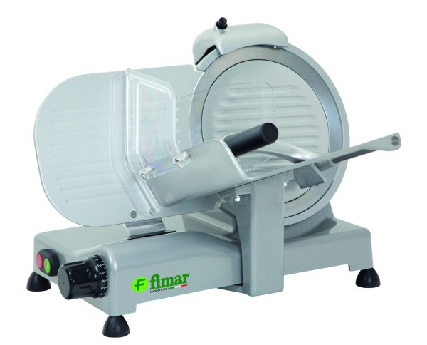 Macchina per affettare salumi, formaggi, carni ecc. Struttura in lega leggera di alluminio verniciato – blocco piatto vela con sistema “Easy Clean“ per una facile pulizia – anello fisso protezione lama – spessore taglio fino a 14÷16 mm