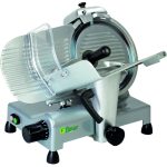 Macchina per affettare salumi, formaggi, carni ecc. Struttura in lega leggera di alluminio verniciato – blocco piatto vela con sistema “Easy Clean“ per una facile pulizia – anello fisso protezione lama – spessore taglio fino a 14÷16 mm