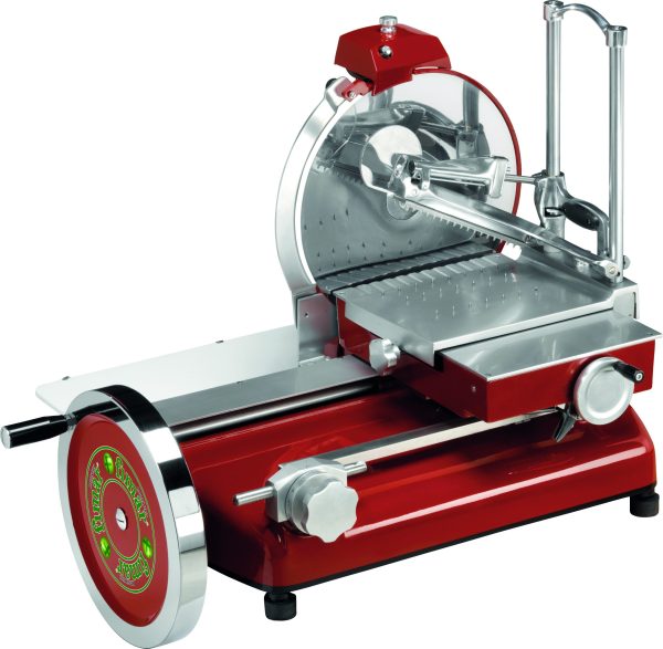 Macchina manuale per affettare salumi. Struttura verniciata a fuoco di colore rosso o nero – anello fisso protezione lama – regolazione spessore taglio e avanzamento automatico del carrello. Spessore taglio da 0 a 25 mm. Accessori: piedistallo in ghisa verniciato di colore rosso o nero.