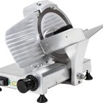 Macchina per affettare salumi, formaggi, ecc. Struttura in lega leggera di alluminio anodizzato – anello fisso protezione lama – paralama estraibile – pomello regolazione vela con scala graduata – affilatoio fisso con coppia di smerigli per l’affilatura della lama. Spessore di taglio fino a 15 mm -blocco piatto-vela.