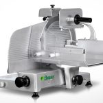 Macchina per affettare salumi, carne, formaggi, ecc. Struttura in lega leggera di alluminio anodizzato – blocco piatto-vela per rimozione carrello – disponibili con piatto carne – spessore taglio 0÷16 mm – anello fisso protezione lama – paralama estraibile – pomello regolazione vela con scala graduata – affilatoio fisso con coppia di smerigli per l’affilatura della lama.