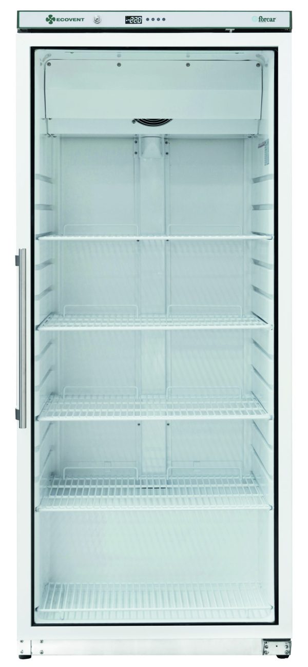 Armadi refrigerati ECOVENT con refrigerazione ventilata. Struttura esterna in lamiera verniciata epossidica bianca o in acciaio inox AISI 201 – interno in PS – porta in vetro – pannelli esterni di fondo e retro in lamiera zincata.