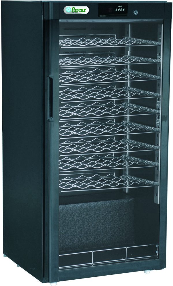 Cantinette vini refrigerate- statica – modello BJ.Cantinette per vini con refrigerazione statica. Centralina e display digitali – temperatura differenziata a seconda della posizione (da +5°C del ripiano inferiore a +18°C di quello superiore) – struttura esterna verniciata nera – interno alluminio nero goffrato – luce interna LED – doppio vetro temperato con protezione raggi UV – chiusura a porta con chiave. Al momento dell’ordine è possibile scegliere griglie in acciaio fisse o in legno scorrevoli.