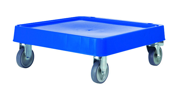 Carrelli portacestelli per lavastoviglie. Vasca in ABS – disponibile con o senza manico in acciaio inox – ruote multidirezionali ø 125 mm di cui due con freno. Ceste non incluse.