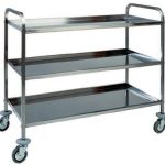 Struttura tubolare ø 25 mm in acciaio inox AISI 304 – ripiani in acciaio inox AISI 304, stampati in forma di vassoio con bordi arrotondati e alto spessore, insonorizzati e con finitura satinata – paracolpi in gomma – ruote multidirezionali ø 125 mm.