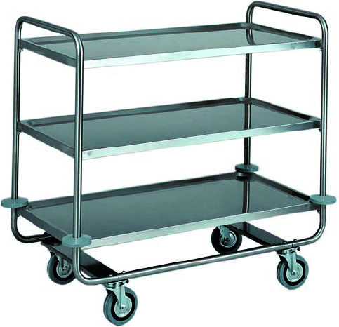 Carrelli di servizio inox per trasporto pesante. Struttura tubolare tonda ø 25 mm, in acciaio inox AISI 304 – ripiani in acciaio inox AISI 304 , stampati in forma di vassoio con bordi arrotondati e alto spessore, insonorizzati e con finitura satinata – paracolpi in gomma – ruote multidirezionali ø 125 mm.