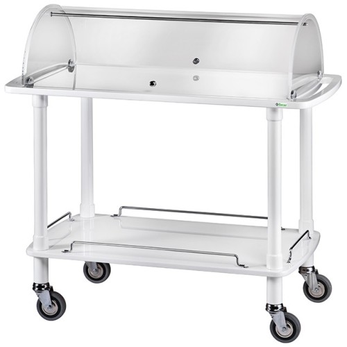 Carrelli di servizio in legno con cupola. Struttura in legno massello – ripiani in multistrato di betulla – cupola semicircolare in plexiglass apribile su due lati – maniglie di spinta integrate nel piano superiore – ringhiere di contenimento sui piani inferiori – ruote multidirezionali di serie ø 95 mm.