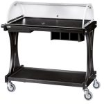 Carrelli di servizio in legno con cupola. Struttura portante in legno multistrato di betulla – cupola semicircolare in plexiglass apribile su due lati – maniglia di spinta in legno – 2 ripiani – ruote multidirezionali ø 100 mm.