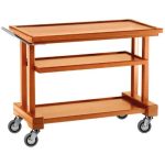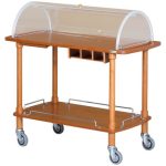 Carrelli di servizio in legno con cupola. Struttura in legno massello – ripiani in multistrato di betulla – cupola semicircolare in plexiglass apribile su due lati – maniglie di spinta integrate nel piano superiore – ringhiere di contenimento sui piani inferiori – ruote multidirezionali di serie ø 95 mm.