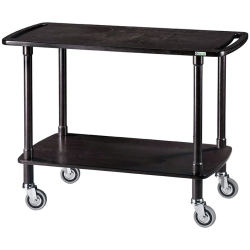 Carrello di servizio in legno. Struttura in legno massello – ripiani in multistrato di betulla – maniglie di spinta integrate nel piano superiore – ringhiere di contenimento sui piani inferiori – ruote multidirezionali ø 95 mm.