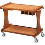 Carrello di servizio in legno. Struttura in legno multistrato di betulla – ripiani in nobilitato – cornice perimetrale e maniglia in legno massello – ruote multidirezionali di serie ø 95 mm.