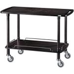 Carrello di servizio in legno. Struttura in legno massello – ripiani in multistrato di betulla – maniglie di spinta integrate nel piano superiore – ringhiere di contenimento sui piani inferiori – ruote multidirezionali ø 95 mm.