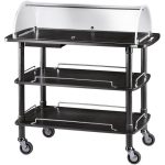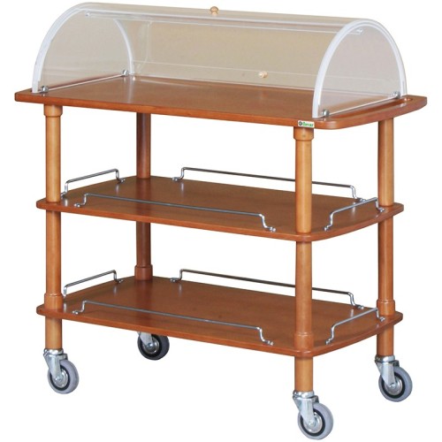 Carrelli di servizio in legno con cupola. Struttura in legno massello – ripiani in multistrato di betulla – cupola semicircolare in plexiglass apribile su due lati – maniglie di spinta integrate nel piano superiore – ringhiere di contenimento sui piani inferiori – ruote multidirezionali di serie ø 95 mm.