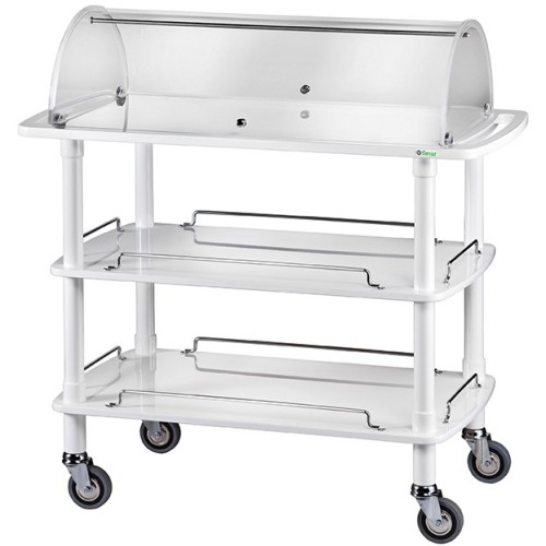 Carrelli di servizio in legno con cupola. Struttura in legno massello – ripiani in multistrato di betulla – cupola semicircolare in plexiglass apribile su due lati – maniglie di spinta integrate nel piano superiore – ringhiere di contenimento sui piani inferiori – ruote multidirezionali di serie ø 95 mm.