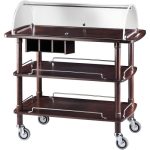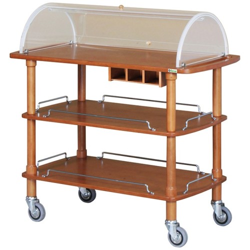 Carrelli di servizio in legno con cupola. Struttura in legno massello – ripiani in multistrato di betulla – cupola semicircolare in plexiglass apribile su due lati – maniglie di spinta integrate nel piano superiore – ringhiere di contenimento sui piani inferiori – ruote multidirezionali di serie ø 95 mm.