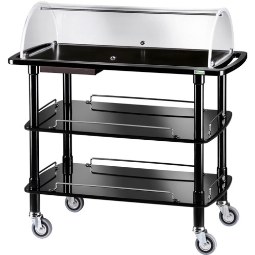 Carrelli di servizio in legno con cupola. Struttura in legno massello – ripiani in multistrato di betulla – cupola semicircolare in plexiglass apribile su due lati – maniglie di spinta integrate nel piano superiore – ringhiere di contenimento sui piani inferiori – ruote multidirezionali di serie ø 95 mm.