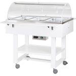 Carrelli termici a bagnomaria in legno con cupola in plexiglass. Struttura in legno multistrato di betulla – cupola semicircolare in plexiglass – riscaldato con resistenza elettrica – modelli con 2 mensole ripieghevoli – ruote multidirezionali ø 75 mm. di cui 2 con freno. Bacinelle escluse – le temperature di lavoro indicate sono da considerarsi con coperchi posizionati.