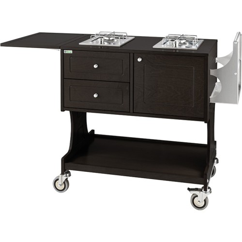Carrelli Flambè. Struttura portante in legno multistrato di betulla – rivestimento in legno massello di castagno – piano di cottura in acciaio inox – ribaltina laterale – portabottiglie in acciaio cromato – 2 cassetti – vano porta bombola da 2 kg – 2 ruote con freno ø 100 mm.