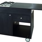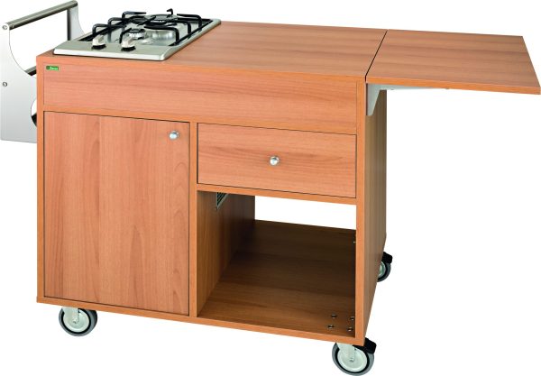 Carrelli Flambè. Struttura portante in legno nobilitato – piano di cottura in acciaio inox con bruciatore regolabile – ribaltina laterale portabottiglie in acciaio cromato – 1 cassetto – 1 sportello vano porta bombola da 3 Kg – 4 ruote con freno ø 100 mm.