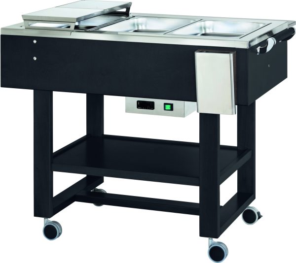 Carrello termico in legno, ideale per bolliti e arrosti. Struttura portante in legno multistrato di betulla – vasca in acciaio inox ansi 304 munita di scarico. Bacinelle escluse.