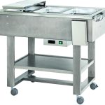 Carrello termico in legno, ideale per bolliti e arrosti. Struttura portante in legno multistrato di betulla – vasca in acciaio inox ansi 304 munita di scarico. Bacinelle escluse.