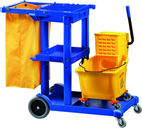 Carrello per pulizia. Telaio e impugnatura in plastica – secchio con strizzatore in plastica – portasacco con sacco da 120 L – attacco porta utensili.