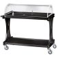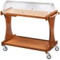 Carrelli portapiatti armadiati e riscaldati. Struttura portante in acciaio plastificato – termostato regolabile – telaio in alluminio anodizzato – pannellatura in perfex con n. 4 sportelli apribili in plexiglass – griglie cromate- maniglie laterali per conduzione carrello – ruote ø 125 mm di cui due con freno.