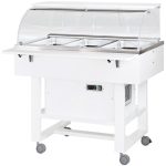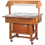 Carrelli refrigerati in legno con cupola in plexiglass. Struttura in legno multistrato di betulla – cupola semicircolare in plexiglass – refrigerazione statica – modelli disponibili con 1 mensola ripieghevole e 1 piano di appoggio – ruote multidirezionali ø 75 mm. di cui 2 con freno. Bacinelle escluse – le temperature di lavoro indicate sono da considerarsi con coperchi posizionati.