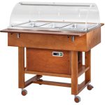 Carrelli refrigerati in legno con cupola in plexiglass. Struttura in legno multistrato di betulla – cupola semicircolare in plexiglass – refrigerazione statica – modelli con 2 mensole ripieghevoli – ruote multidirezionali ø 75 mm. di cui 2 con freno. Bacinelle escluse – le temperature di lavoro indicate sono da considerarsi con coperchi posizionati.