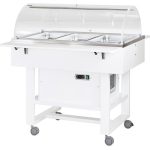 Carrelli refrigerati in legno con cupola in plexiglass. Struttura in legno multistrato di betulla – cupola semicircolare in plexiglass – refrigerazione statica – modelli con 2 mensole ripieghevoli – ruote multidirezionali ø 75 mm. di cui 2 con freno. Bacinelle escluse – le temperature di lavoro indicate sono da considerarsi con coperchi posizionati.