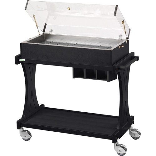 Carrelli di servizio in legno con cupola. Struttura portante in legno multistrato di betulla – cupola in plexiglass trasparente 150(h) mm – vasca e griglia in acciaio inox – 8 piastre eutettiche refrigeranti – ruote multidirezionali ø 100 mm. Può contenere numero 5 bacinelle GN1/4 con 40(h) mm oppure 5 bacinelle GN1/6 con 40(h) mm.