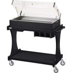 Carrelli di servizio in legno con cupola. Struttura portante in legno multistrato di betulla – cupola in plexiglass trasparente 150(h) mm – vasca e griglia in acciaio inox – 8 piastre eutettiche refrigeranti – ruote multidirezionali ø 100 mm. Può contenere numero 5 bacinelle GN1/4 con 40(h) mm oppure 5 bacinelle GN1/6 con 40(h) mm.