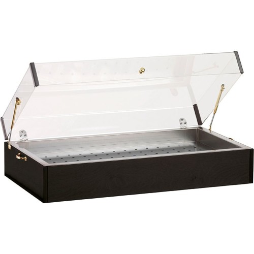 Espositore ghiacciaia. Struttura in legno con vasca e griglia in acciaio inox – cupola plexiglass – provvisto di 8 contenitori eutettici.