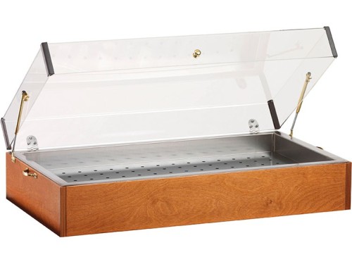 Espositore ghiacciaia. Struttura in legno con vasca e griglia in acciaio inox – cupola plexiglass – provvisto di 8 contenitori eutettici.