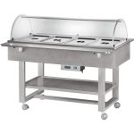 Espositore termico a bagnomaria in legno con cupola. Struttura in legno multistrato di betulla – cupola semicircolare in plexiglass – riscaldato con resistenza elettrica – disponibile con 2 mensole ripieghevoli – ruote Ø 75 mm. di cui 2 con freno. Bacinelle escluse – le temperature di lavoro indicate sono da considerarsi con coperchi posizionati.
