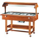 Espositore termico a bagnomaria in legno con cupola. Struttura in legno multistrato di betulla – cupola semicircolare in plexiglass – riscaldato con resistenza elettrica – disponibile con 1 mensola ripieghevole e 1 piano di appoggio – ruote Ø 75 mm. di cui 2 con freno. Bacinelle escluse – le temperature di lavoro indicate sono da considerarsi con coperchi posizionati.