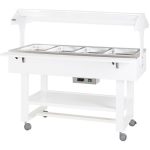 Espositore termico a bagnomaria in legno con cupola. Struttura in legno multistrato di betulla – cupola semicircolare in plexiglass – riscaldato con resistenza elettrica – disponibile con 1 mensola ripieghevole e 1 piano di appoggio – ruote Ø 75 mm. di cui 2 con freno. Bacinelle escluse – le temperature di lavoro indicate sono da considerarsi con coperchi posizionati.