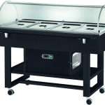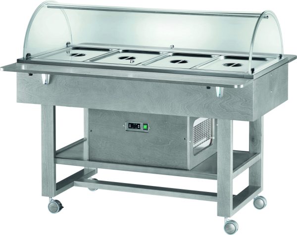 Carrelli refrigerati in legno con cupola. Struttura in legno multistrato di betulla – cupola semicircolare in plexiglass – refrigerazione statica – 2 mensole ripieghevoli – ruote multidirezionali ø 75 mm. di cui 2 con freno. Bacinelle escluse – le temperature di lavoro indicate sono da considerarsi con coperchi posizionati.