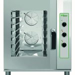 Forni a convezione elettrici. Struttura in acciaio inox – illuminazione interna – 1 ventilatore centrifugo – umidificatore automatico con regolatore di energia per il mod. FN423EV – selettore a 8 funzioni (defrost, 4 modalità a convezione, 2 modalità grill, solo ventola) – porta con doppio vetro interno estraibile – guarnizione porta ad incasso – cassetto raccolta condensa estraibile – guide supporto teglie estraibili – 1 griglia compresa.