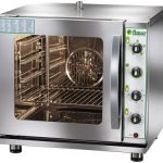 Forno a convezione a gas. Struttura in acciaio inox – illuminazione interna – porta con doppio vetro, vetro interno estraibile – guide supporto teglie estraibili – guarnizione porta ad incasso – cassetto raccolta condensa estraibile – 1 ventilatore centrifugo – umidificatore con regolazione di energia e selettore a 3