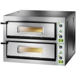 Forni elettrici professionali per la cottura di pizza, focacce, ecc – rivestimento frontale inox – piano di cottura refrattario – isolamento termico mediante rivestimento in lana di roccia – porte con vetro di ispezione in pirex – illuminazione interna – 2 termostati per ogni camera.