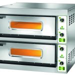 Forni elettrici professionali per la cottura di pizza, focacce, ecc. Rivestimento frontale inox – piano di cottura refrattario – isolamento termico mediante rivestimento in lana di roccia – porte con vetro di ispezione in pirex – pirometri – illuminazione interna – 2 termostati per ogni camera. Versione forni “W“ con dimensioni della camera cottura invertite (più larghi e meno profondi).
