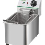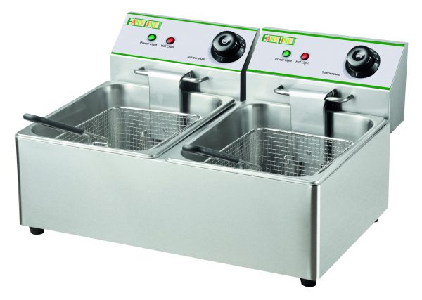 Friggitrici da 8 L – modelli da banco. Struttura, vasca e coperchio in acciaio inox – cestelli a rete estraibili in filo cromato – manici cestelli e pomelli coperchi in plastica termoisolante – resistenze inox – termostato di sicurezza con pulsante di ripristino – versioni a due vasche con doppio termostato per utilizzo indipendente – testata e resistenze removibili. Raggiungono i 180C° in circa 18 minuti – tempo di frittura in circa 7 minuti.