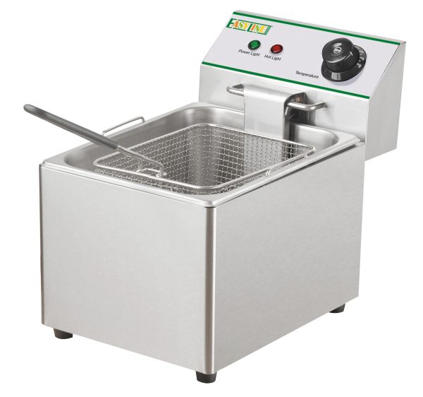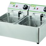 Friggitrici da 8 L – modelli da banco. Struttura, vasca e coperchio in acciaio inox – cestelli a rete estraibili in filo cromato – manici cestelli e pomelli coperchi in plastica termoisolante – resistenze inox – termostato di sicurezza con pulsante di ripristino – versioni a due vasche con doppio termostato per utilizzo indipendente – testata e resistenze removibili. Raggiungono i 180C° in circa 18 minuti – tempo di frittura in circa 7 minuti.