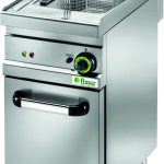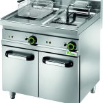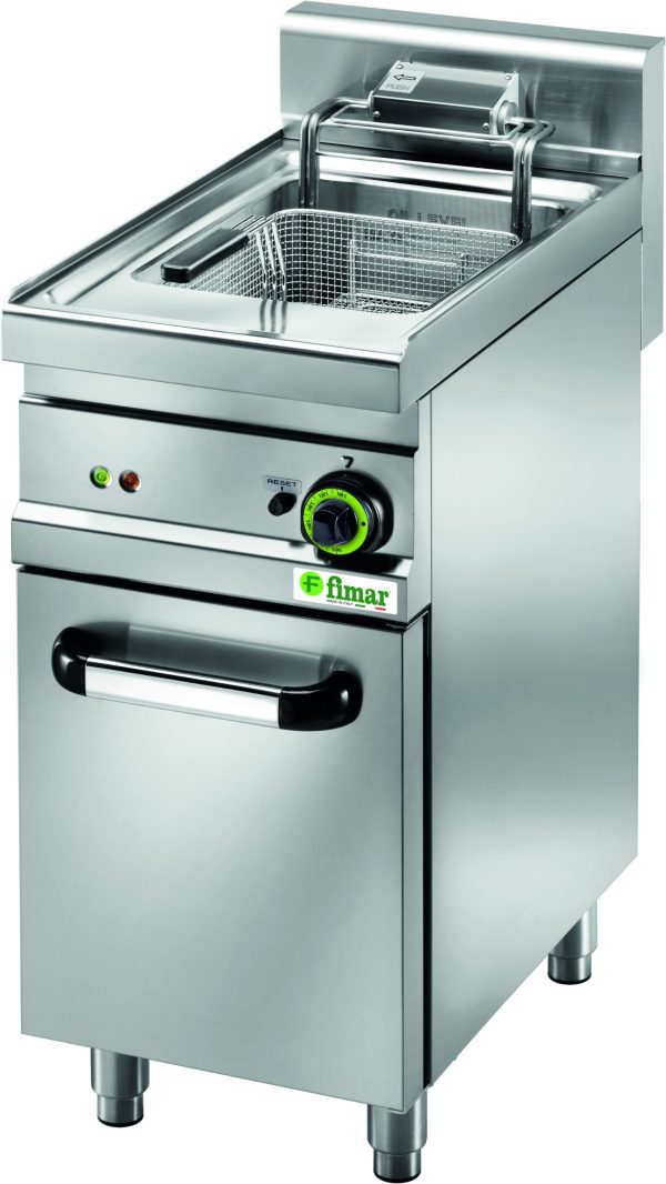 Friggitrici da 18 Lt. Dotate di mobile – struttura, vasche, coperchi, cestelli e resistenze in acciaio inox AISI 304 – manici cestelli e pomelli coperchi in materiale isolante – termostato di sicurezza con pulsante di ripristino – dotate di un cestello grande – rubinetto scarico e bacinella raccogli olio con filtro e beccuccio in acciaio inox – resistenze ribaltabili – reti protezione in vasca. Il modello SFM18D ha due vasche con doppio termostato per utilizzo indipendente. Raggiungono i 190C° in circa 6 minuti, tempo di frittura in circa 5 minuti.