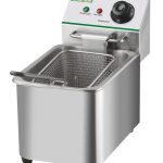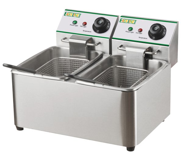 Friggitrici da 4 L – modelli da banco. Struttura, vasca e coperchio in acciaio inox – cestelli a rete estraibili in filo cromato – manici cestelli e pomelli coperchi in plastica termoisolante – resistenze inox – termostato di sicurezza con pulsante di ripristino – versioni a due vasche con doppio termostato per utilizzo indipendente – testata e resistenze removibili. Raggiungono i 180C° in circa 18 minuti – tempo di frittura in circa 7 minuti.